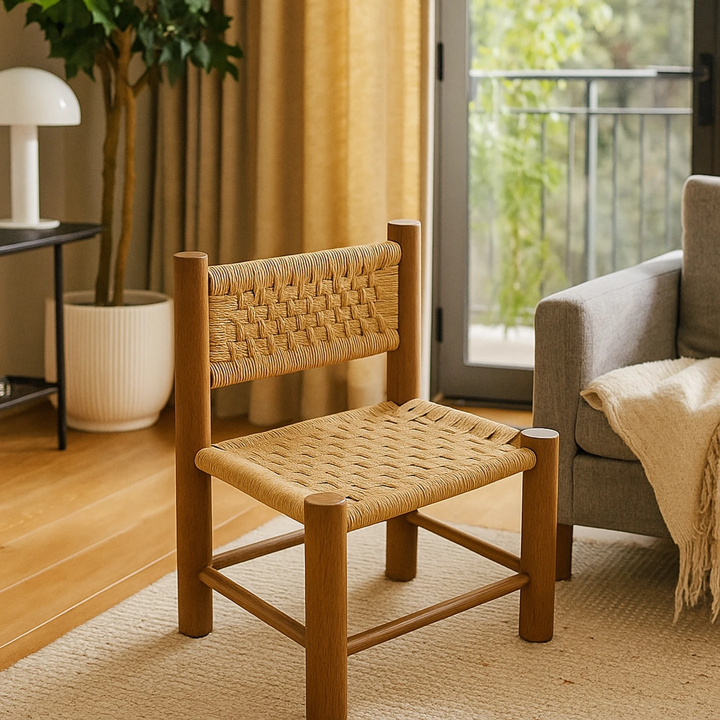 Stylish Solid Wood Shoe Changing Stool - Modern Minimalist Mid-Century Rattan Bench for Home Use, Elegant Short Stool with Backrest and Woven Design