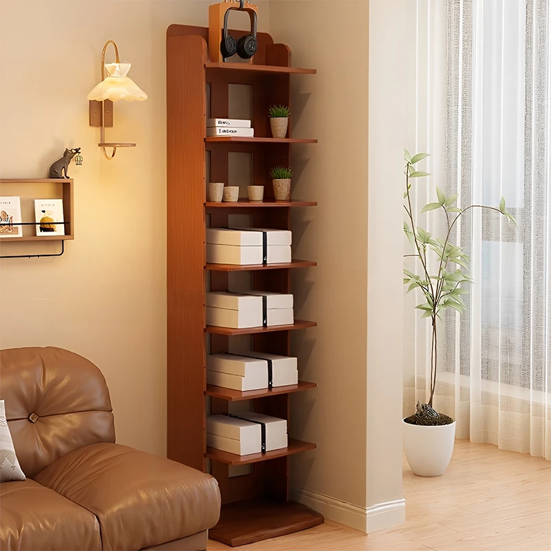 Vintage Solid Wood Rotating Bookshelf - 360-Degree Corner Bookcase, Freestanding Storage Unit, Space-Saving Slim Cabinet, Perfect for Wall Placement and Easy Mobility.