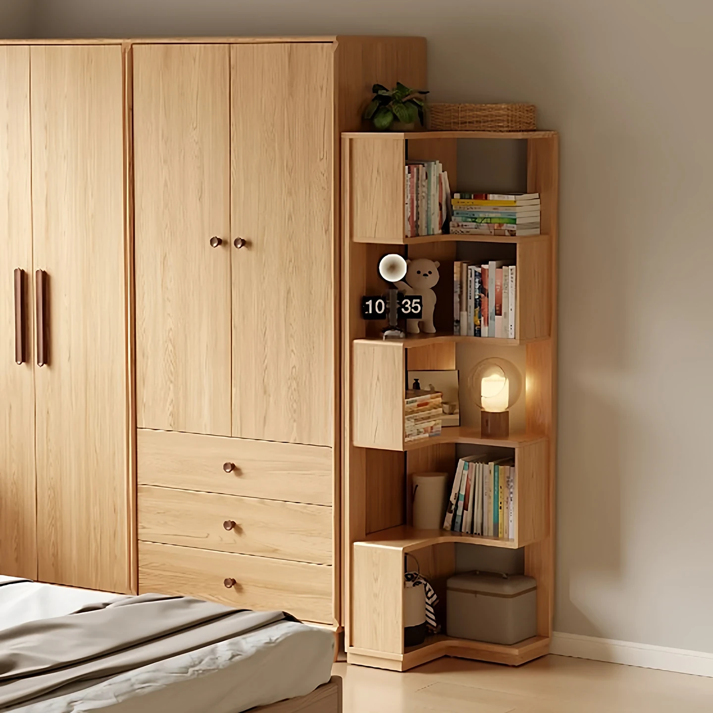 壁に寄せて設置できる角型収納棚|寝室やクローゼットに最適な三角形コーナーキャビネット|スペースを有効活用!おしゃれで実用的な角棚です。
