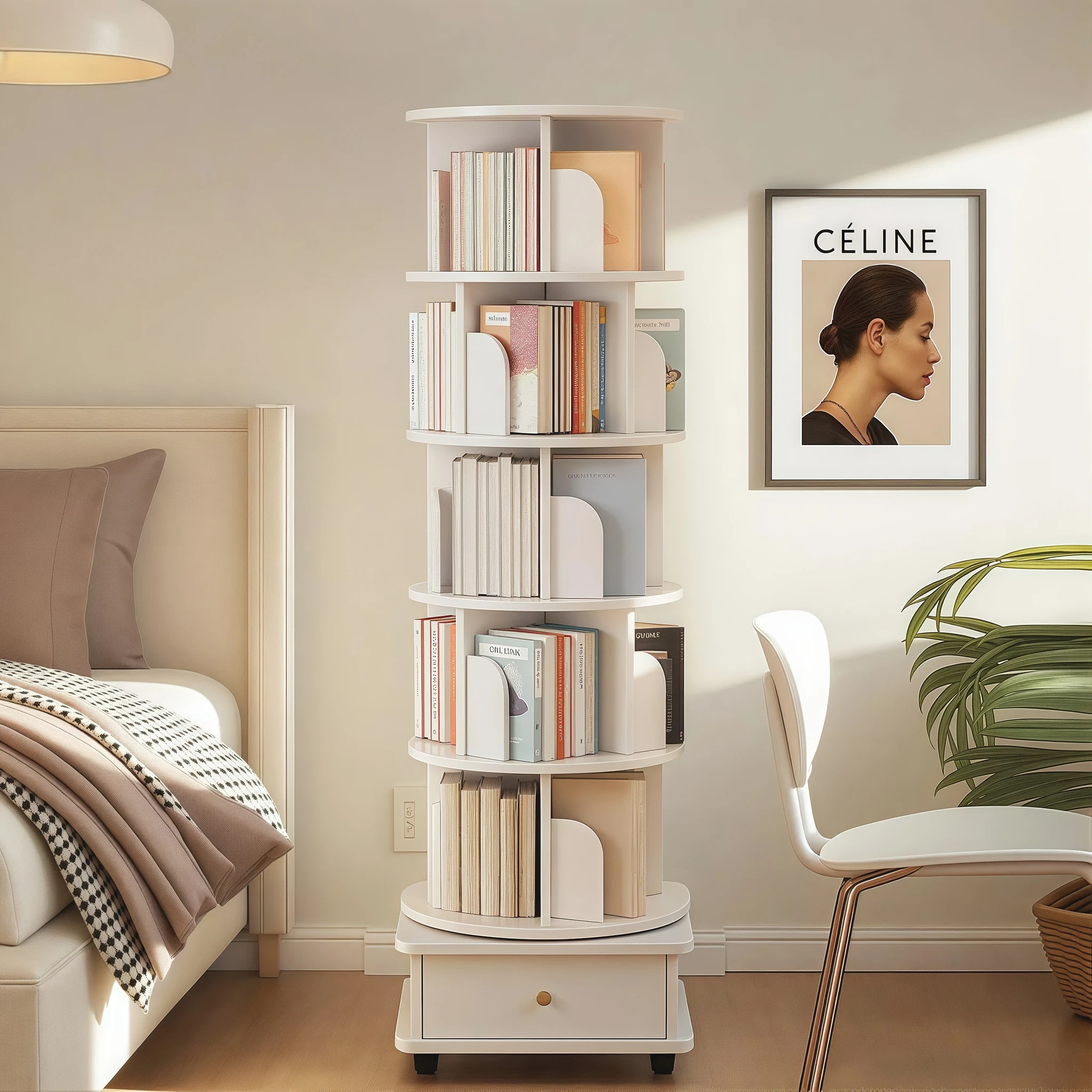 360度回転可能な本棚!おしゃれで便利な移動式収納ラック。寝室にぴったりな丸型絵本ラック。家庭用のフロア展示ラックとして、すっきりとした空間を演出します。