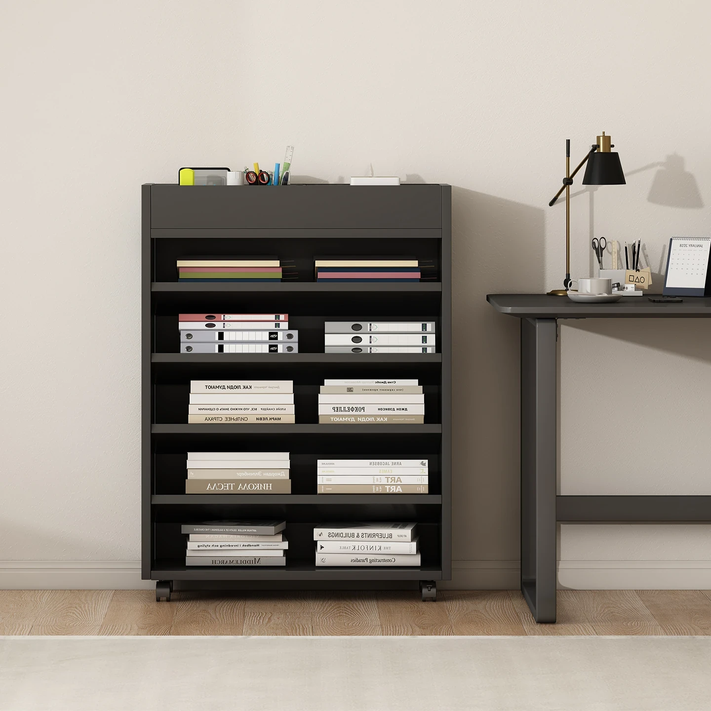 移動可能な黒い小型書棚!中学生にぴったりのスタイリッシュな壁寄せ収納ラック。デスクサイドで便利に使える、スペースを有効活用したアイテムです。