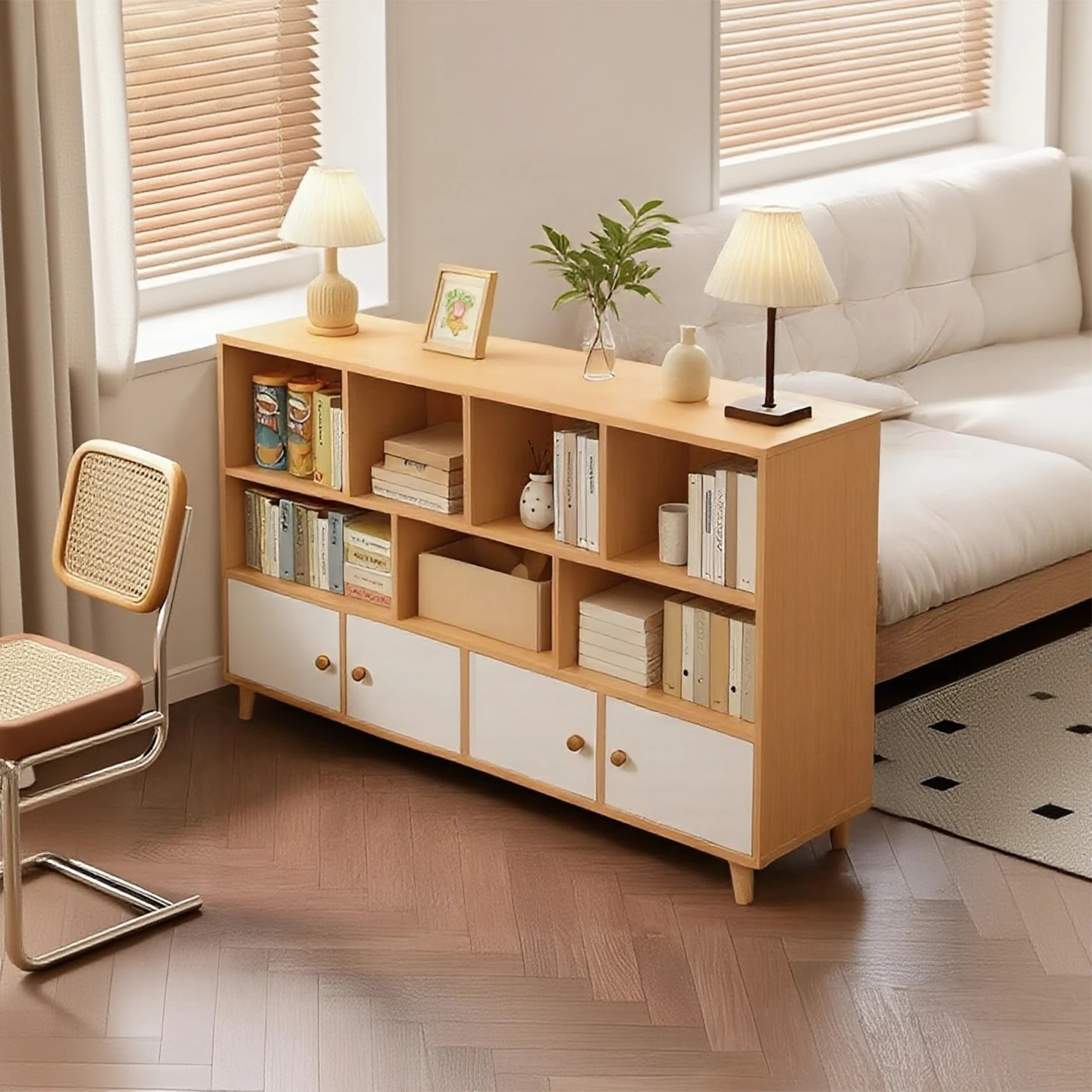 簡単設置のフロア書棚!リビングにぴったりな壁掛け一体型収納ラック。家庭用のグリッドキャビネット、低めのキャビネットで幼稚園の収納にも最適!あなたの空間を美しく整理整頓。
