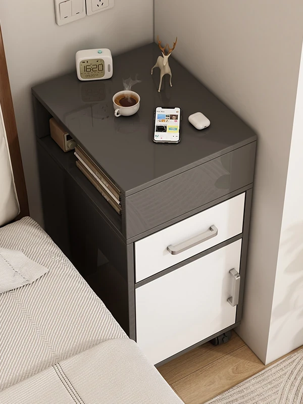 スリムなデザインのベッドサイドキャビネット - シンプルでモダンな収納ラック、狭いスペースでもぴったりフィット!寝室やリビングに最適な移動式収納キャビネット。
