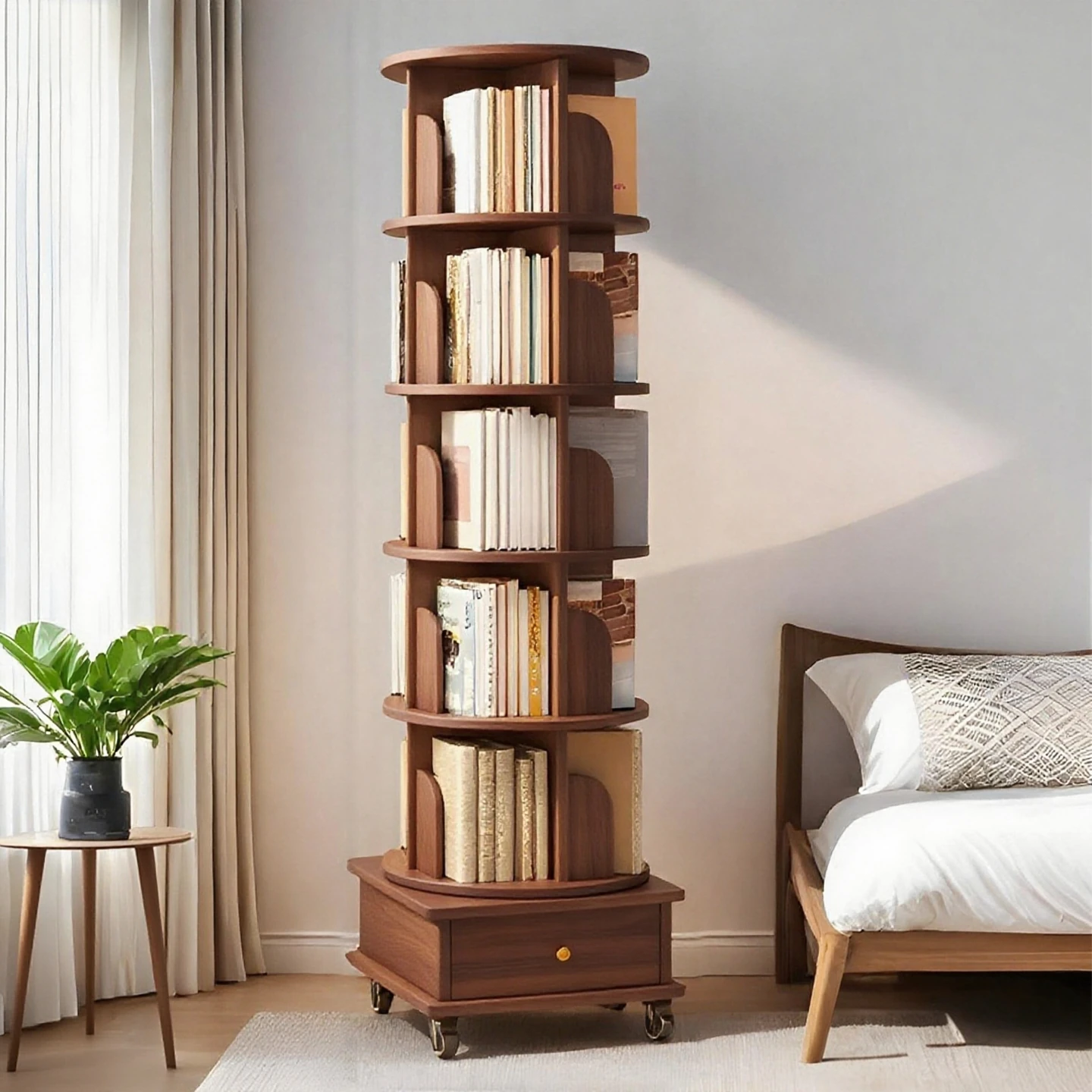 360度回転式のラウンドブックシェルフ!寝室やリビングにぴったりなスタイリッシュな床置き収納ラック。壁に寄せて使える便利なデザインで、スペースを有効活用!あなたの本や小物を美しく収納しましょう。