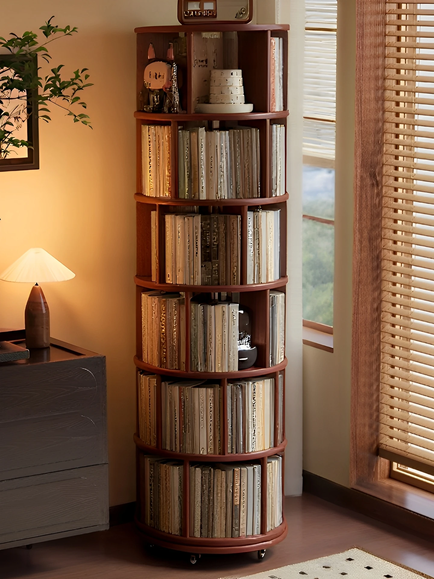 アンティーク風の天然木製360度回転ブックシェルフ!フロアスタンド型収納ラック、壁に寄せられるスリムなデザインで移動もラクラク。おしゃれな収納でお部屋を彩る!