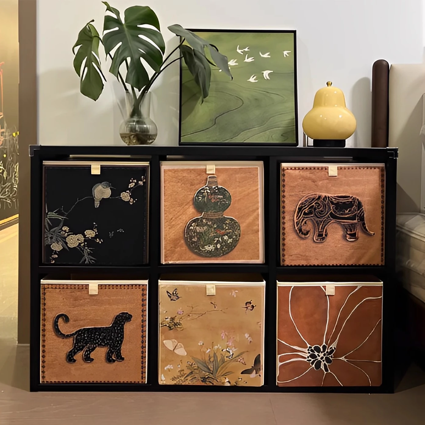 レトロな6格低型書棚、寝室にもぴったりな収納キャビネット。洗練されたブラックカラーで軽やかな高級感を演出。ベッドサイドに最適なスタイリッシュな収納ボックス!