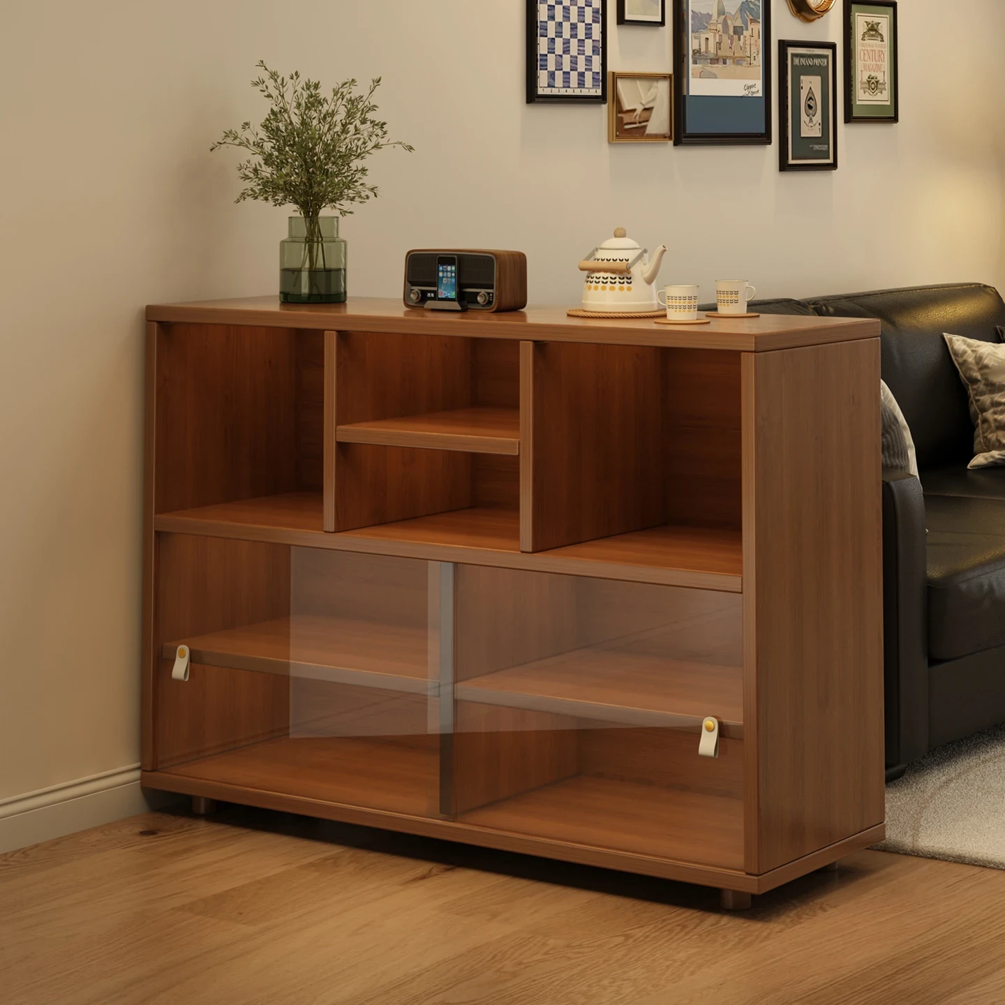 和風デザインの収納キャビネット - リビングやキッチンにぴったりのスタイリッシュなティーキャビネット。脚付きで安定感抜群!壁にぴったり寄せて置ける、広々とした収納スペースでお部屋をすっきり整理。