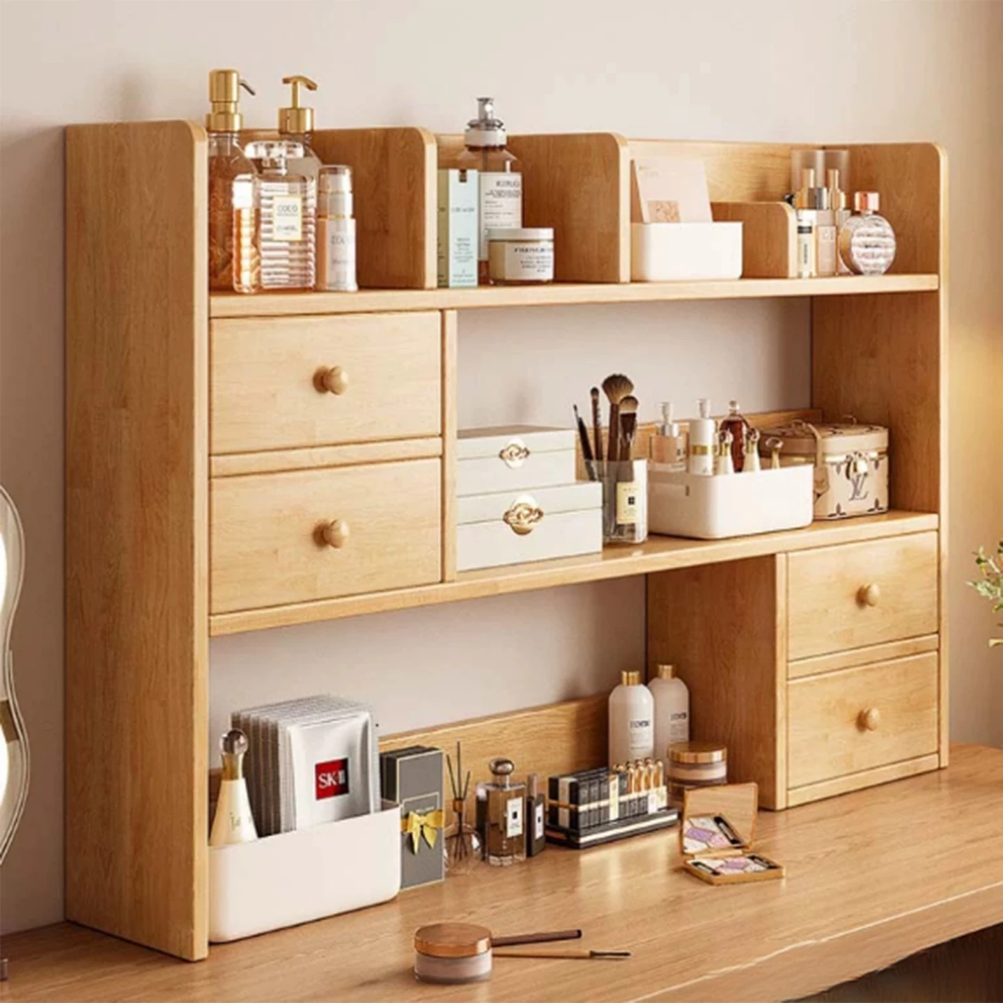 デスク上の収納に最適!ナチュラルウッドの置物ラック - オフィスや家庭で使えるシンプルなブックシェルフ。コンパクトサイズでデスク周りをスッキリ整理!